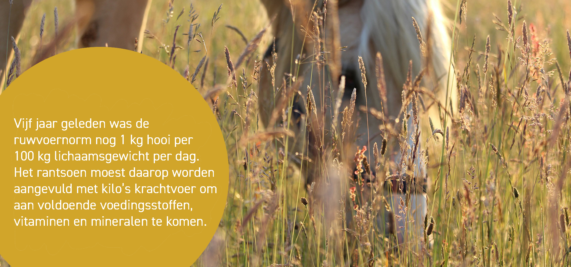 Nu weten we beter! Inmiddels is uit wetenschappelijke onderzoeken gebleken dat bovenstaande hoeveelheden achterhaald zijn. En dat een paard minstens de dubbele hoeveelheid ruwvoer nodig heeft om zijn lichaam gezond te houden en een tevreden gevoel te hebben. Van nature eet een paard zelfs nog veel meer ruwvoer.